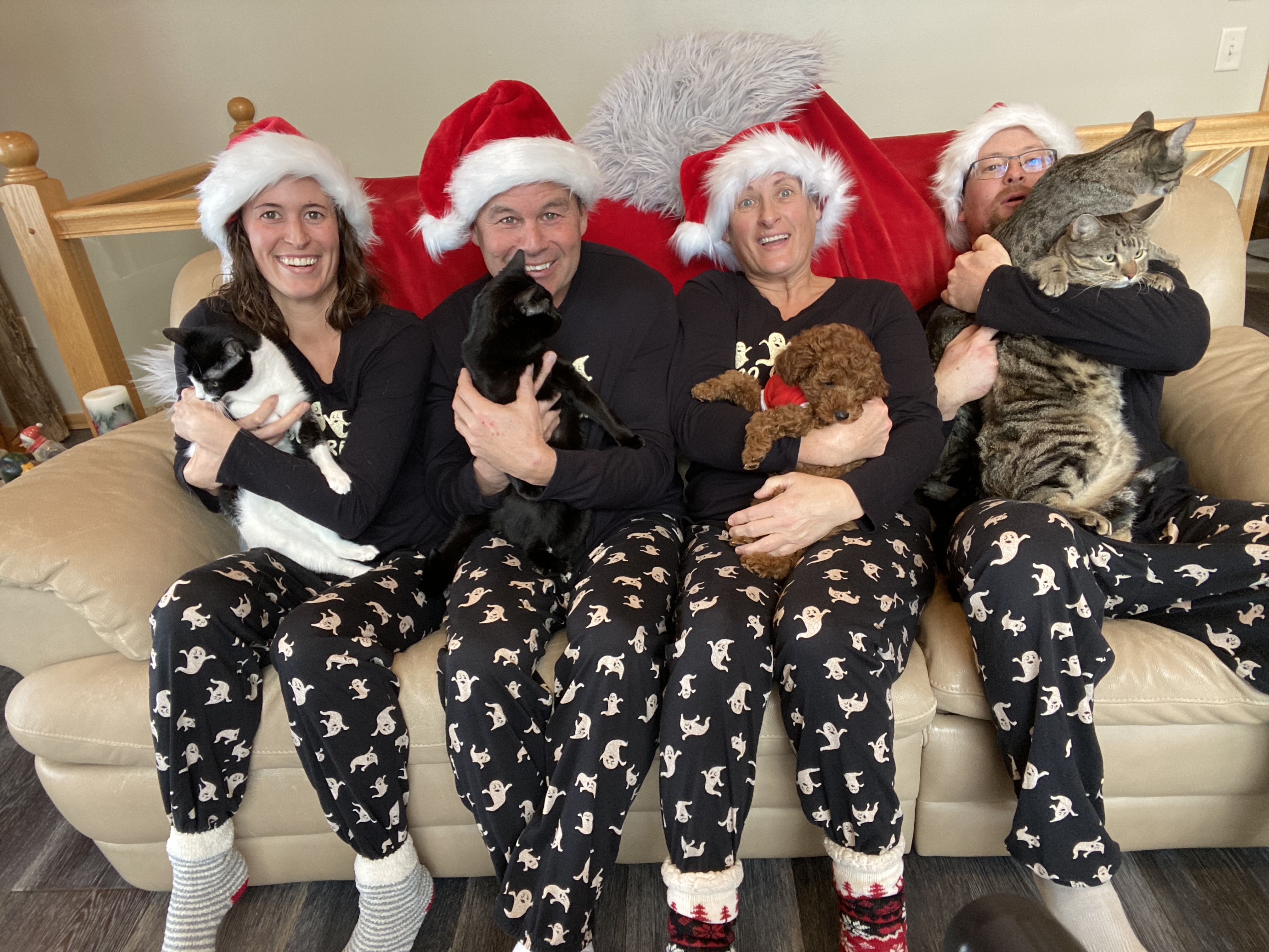 In the photo are Kelly with Chloe, Darren with Cubbie, I with baby Aggie (last year’s Christmas photo), and Troy with his two cats, Oscar and Felix–such an “odd couple”.